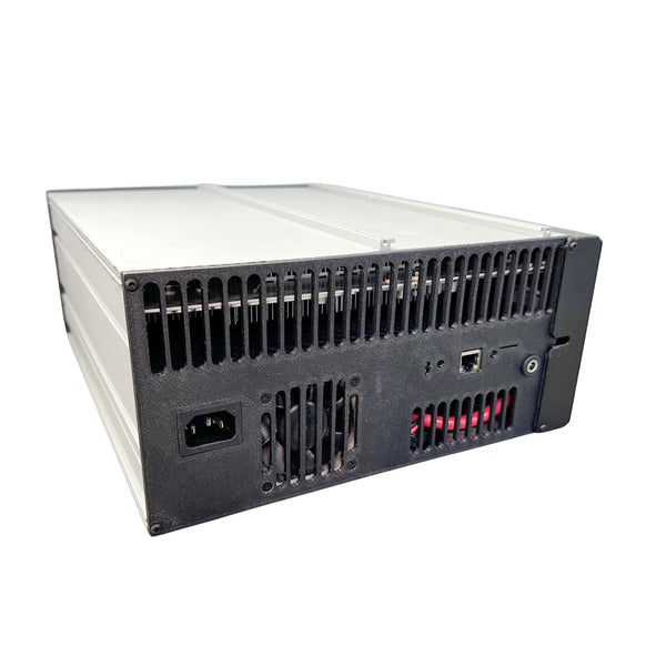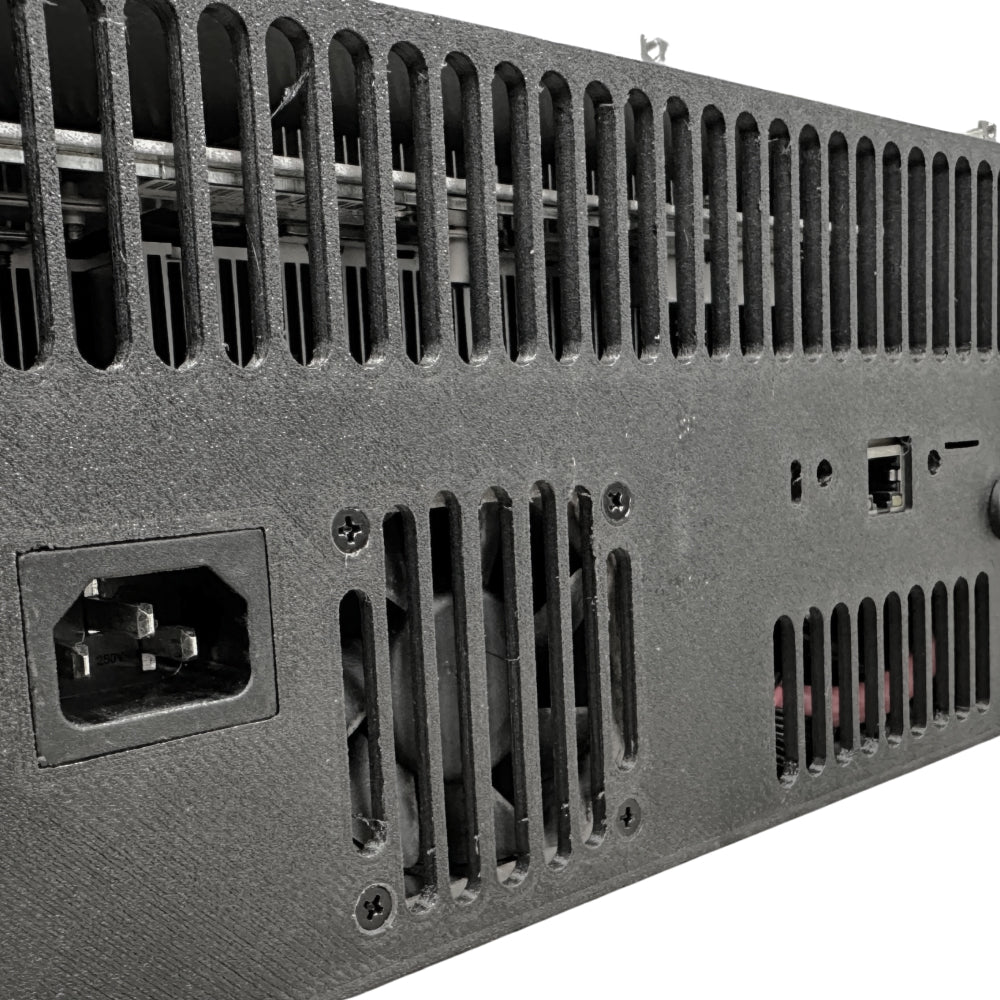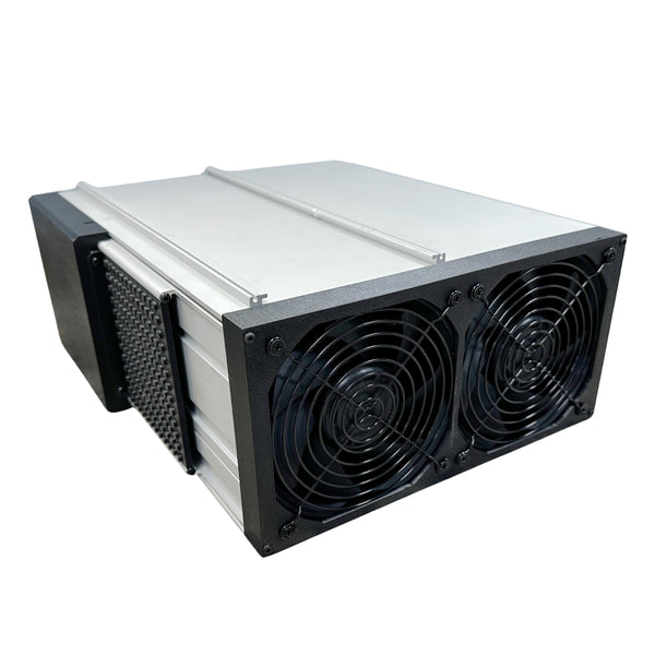 The airflow design only requires 2 fans operating at 50% to achieve that target hashrate. This results in a compact, sound attenuated, Bitcoin miner that can serve as a space heater safely on North American residential outlets where a standard load already exists.